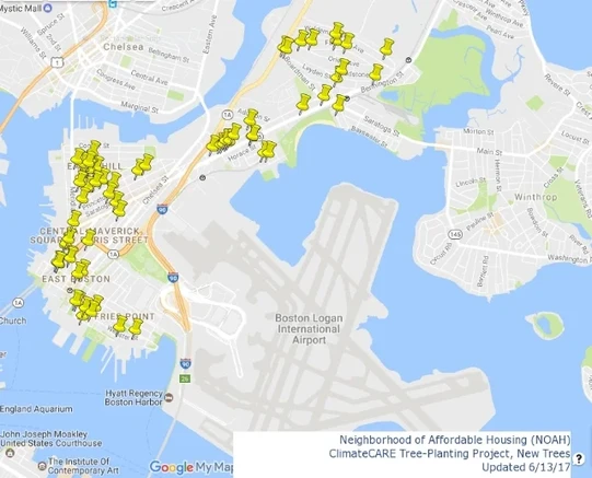This map, created by N-YO, shows all the new trees that were planted by the City of Boston in 2017 in collaboration with NOAH.